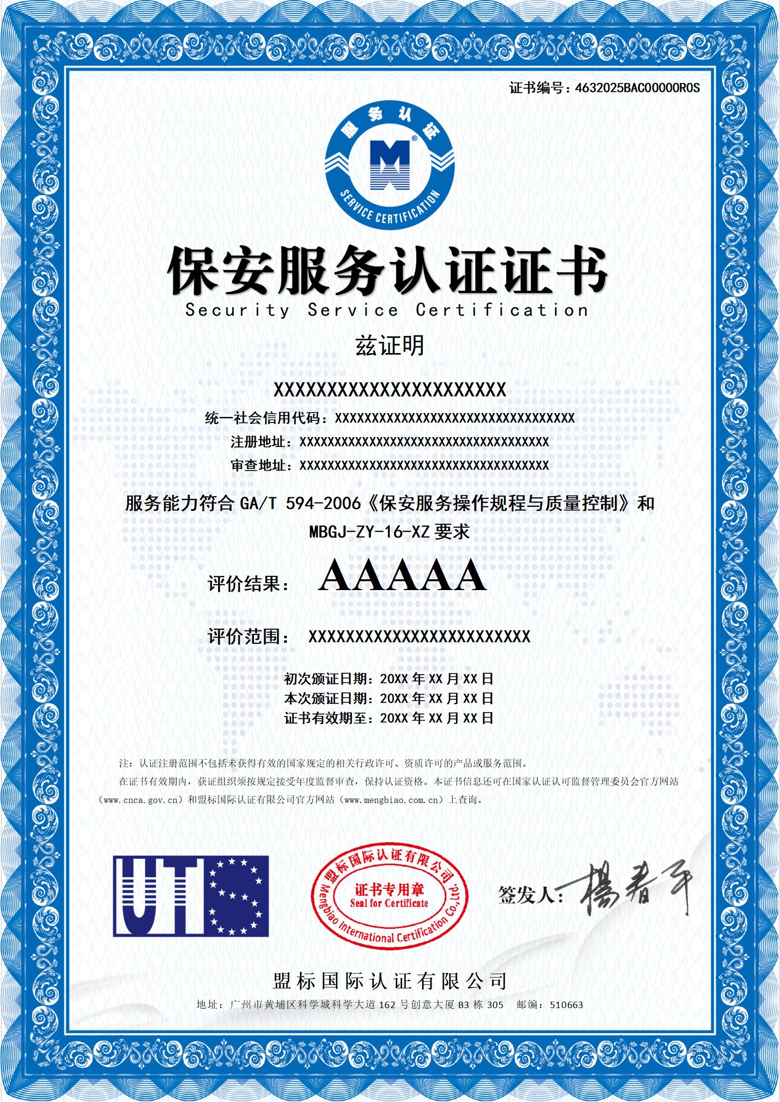 保安服務(wù)認(rèn)證證書(shū)-樣版