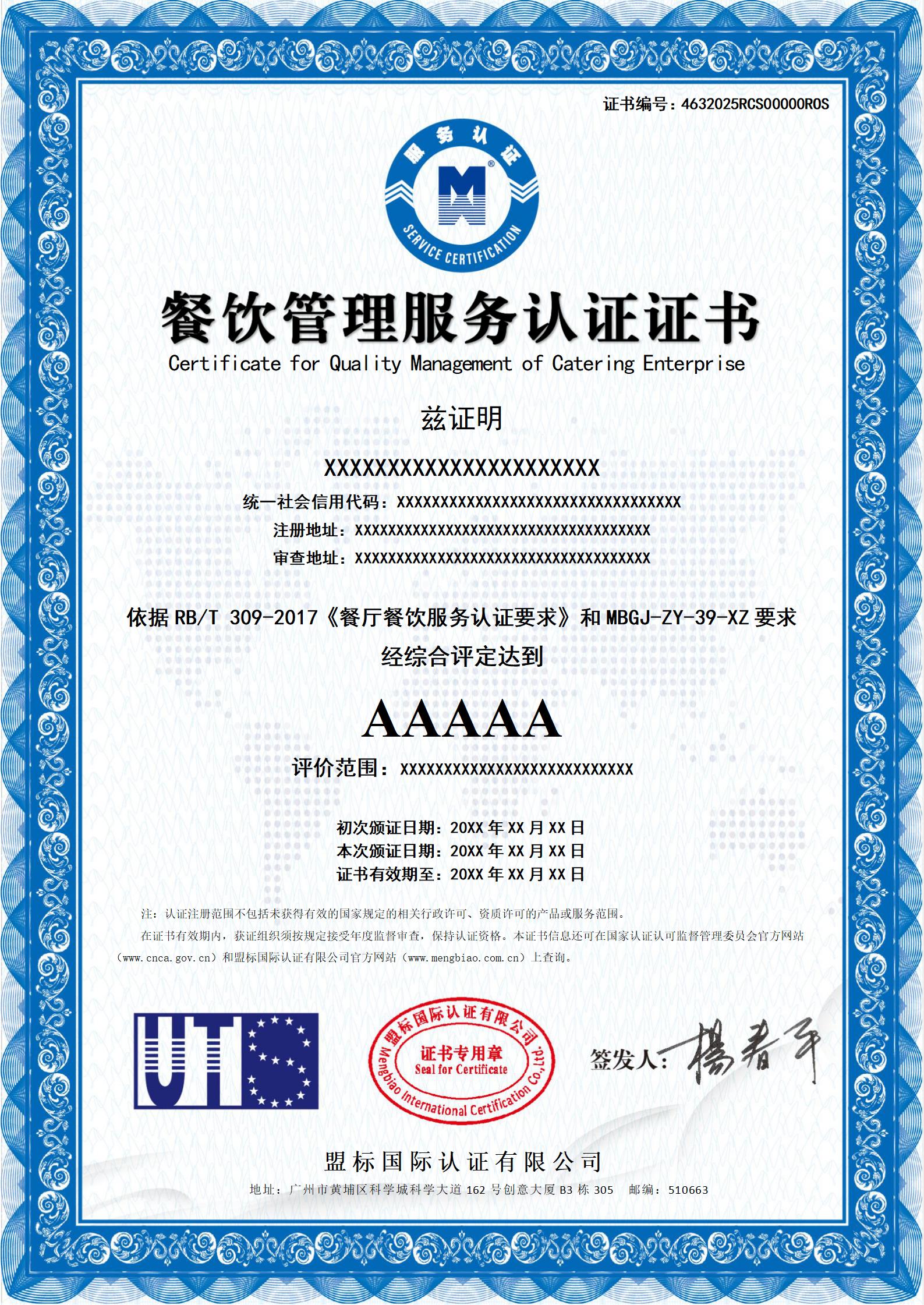 餐飲管理服務(wù)認(rèn)證證書(shū)(CYM)-樣版