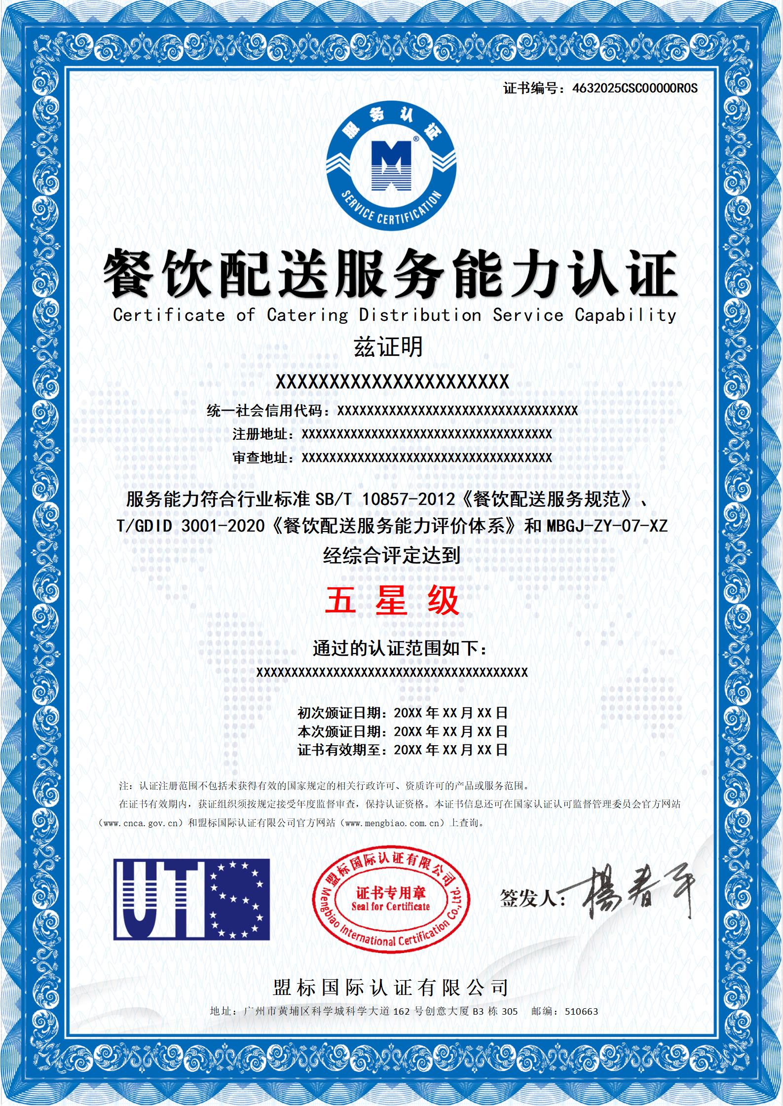 餐飲配送服務(wù)能力認(rèn)證證書(shū)-樣版