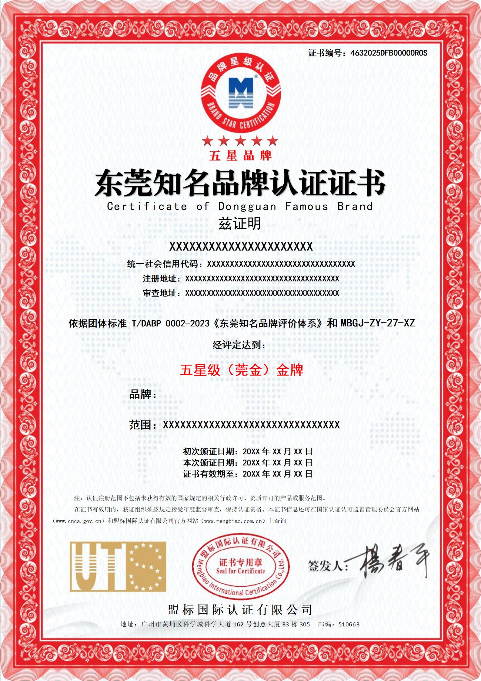 東莞知名品牌認(rèn)證證書(shū)-樣版