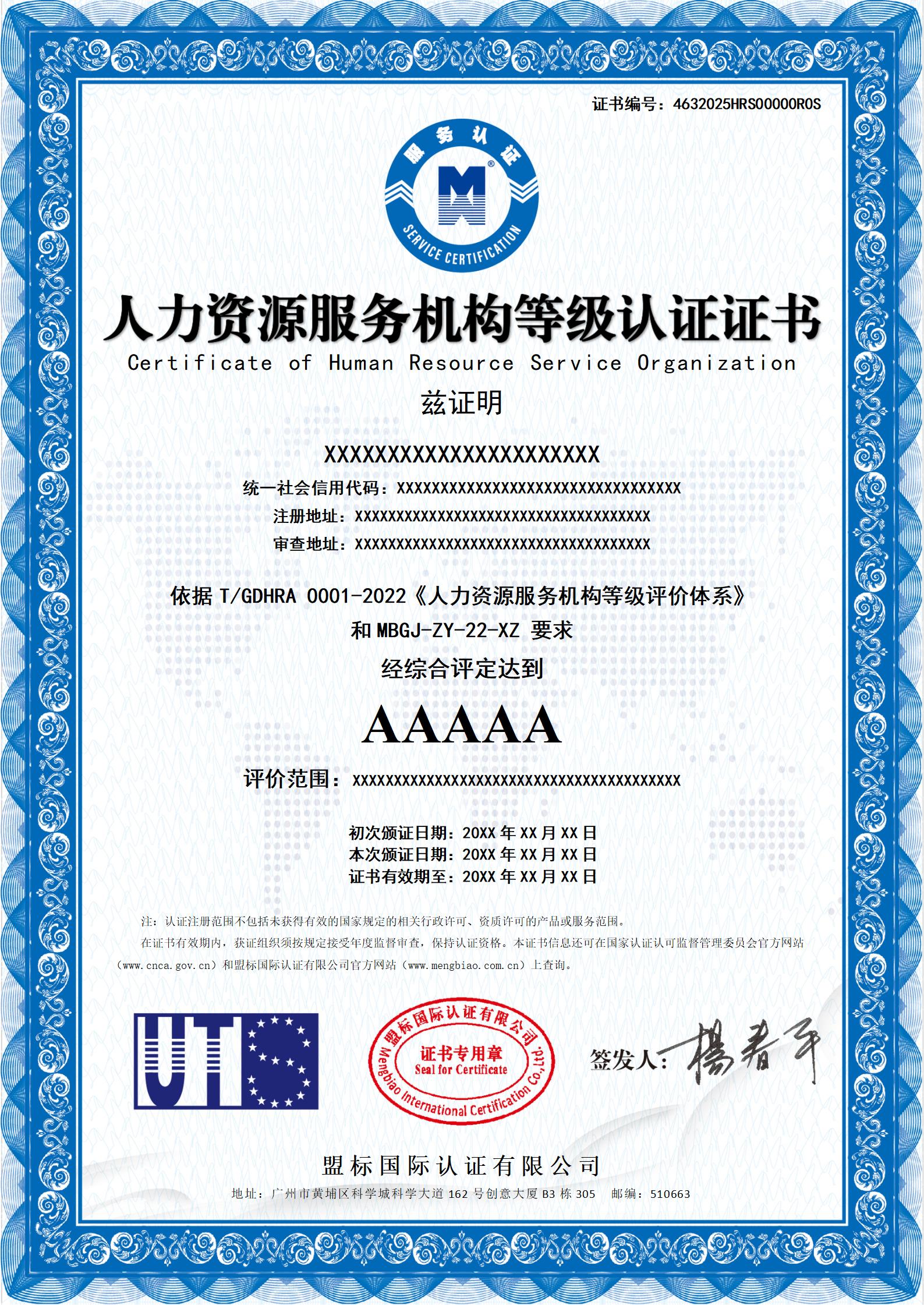 人力資源服務(wù)機(jī)構(gòu)等級認(rèn)證證書-樣版