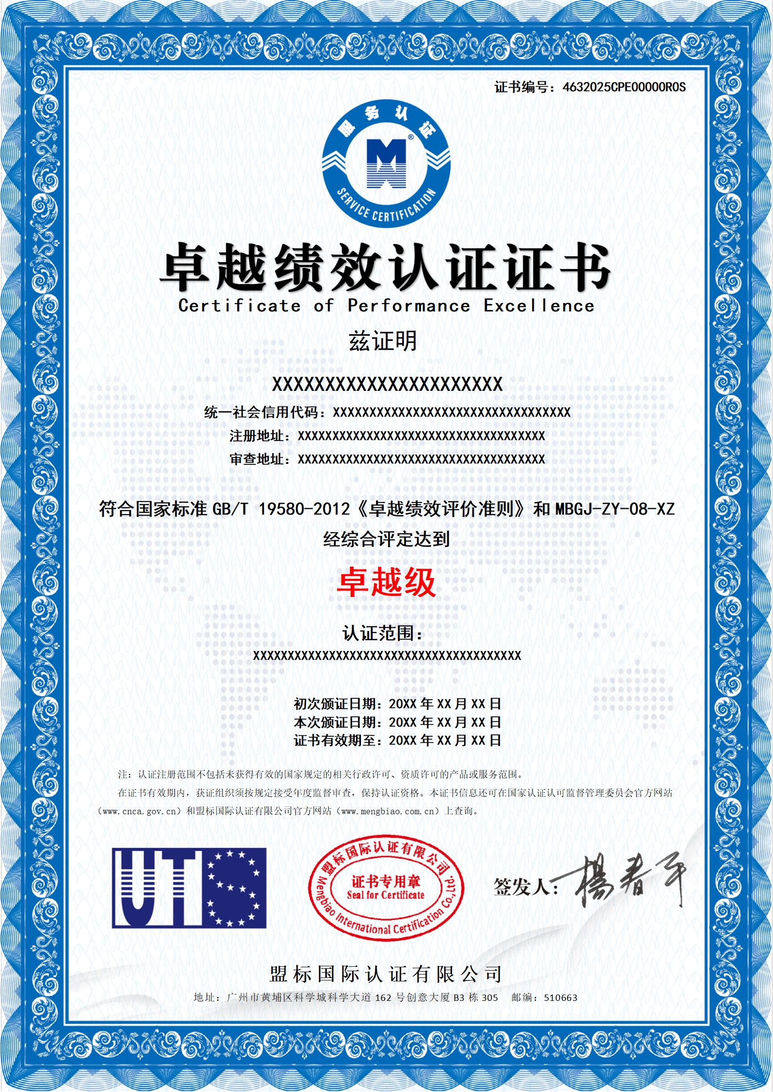 卓越績效認(rèn)證證書-樣版