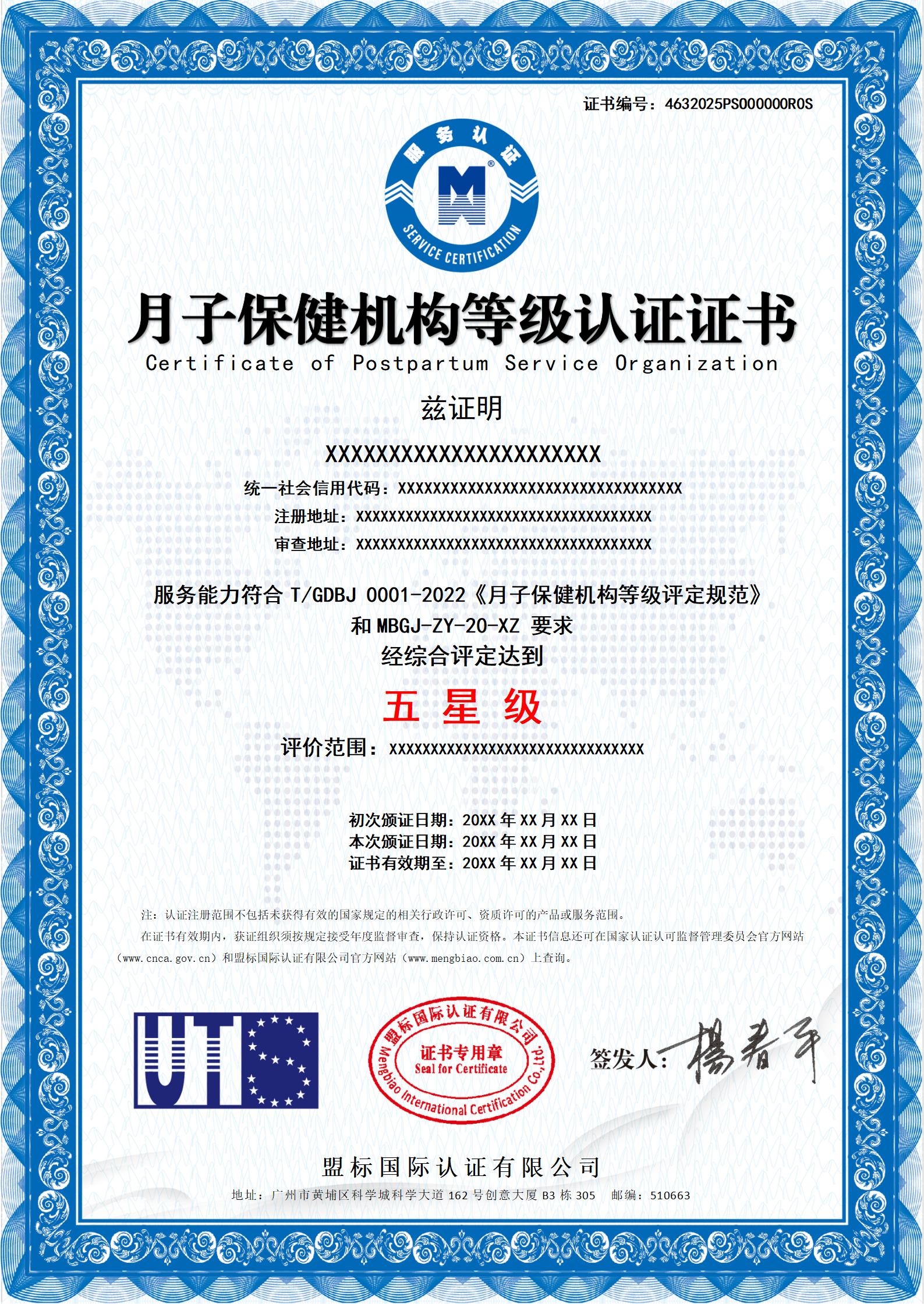 月子保健機(jī)構(gòu)等級(jí)認(rèn)證證書-樣版
